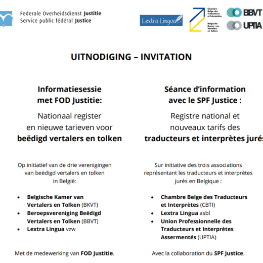 INVITATION : Séance d’information avec le SPF Justice Registre national et nouveaux tarifs des traducteurs et interprètes jurés . Publié le 27/11/2017 Sociale media Share on Facebook Share on Twitter Share on LinkedIn 5a1c3f2c2bad2.pdf NAN 5a1c3f396347a.pdf NAN Suivant Back to news list Précédent